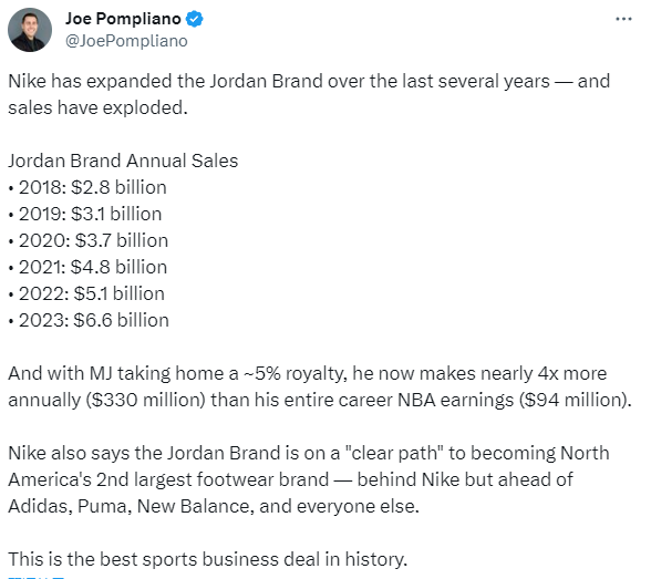 乔丹拥有5%的分红,他现在从分红中得到的年收入约为3.3亿美元,几乎是他整个职业生涯收入的四倍(9400万美元)。耐克方面表示,乔丹品牌正在成为北美第二大鞋类品牌,仅次于耐克;领先阿迪达斯、新百伦等品牌,这是体育史上最好的商业交易。
