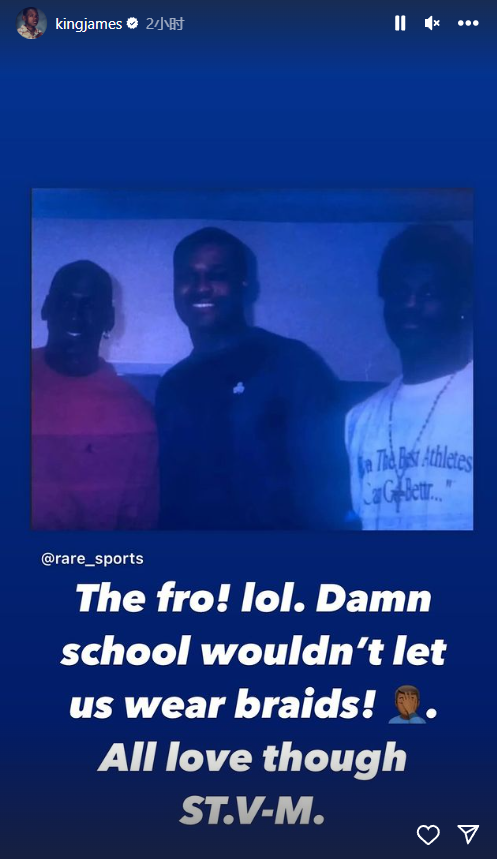 詹姆斯还转发高中时期与乔丹的合影,合影中三人分别是迈克尔-乔丹、安托万-沃克和勒布朗-詹姆斯;老詹配文写道:爆炸头!哈哈。该死的学校不让我们留小脏辫!不过,圣文森特圣玛丽,我还是对你爱意满满。