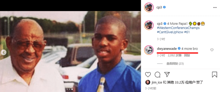 不久前,太阳领袖保罗更新社交媒体,晒出西部冠军大合影、G6贡献值以及与papa的合影老照片,并且写道:papa,离夺得总冠军还差四场胜利;韦德第一时间在评论区留言:兄弟,还差4场胜利。
