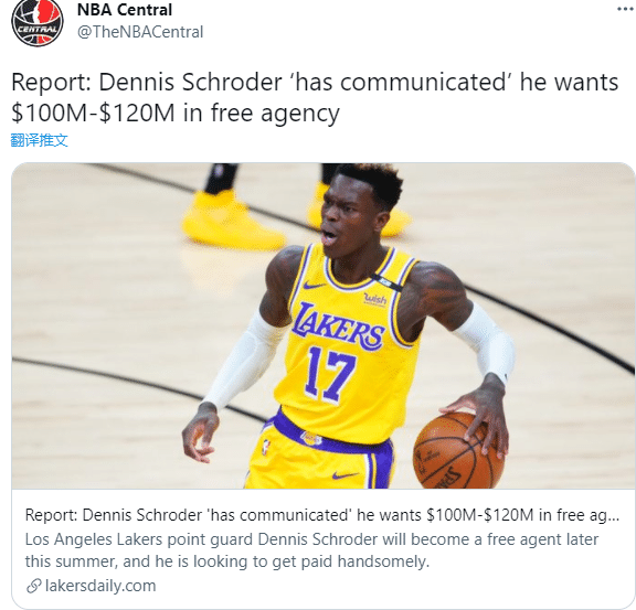 施罗德曾拒绝湖人4年8400万美元的提前续约合同,如今美媒爆料施罗德索要最多1.2亿美元的大合同,从20-21赛季的表现来看,恐怕他很难拿到这么大的合同。