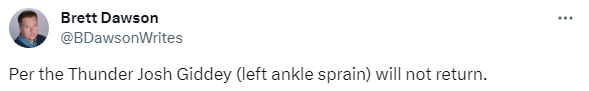 受伤离场前,吉迪首发出战14分钟,5投4中、三分3中3拿到11分3篮板4助攻以及出现5次失误,