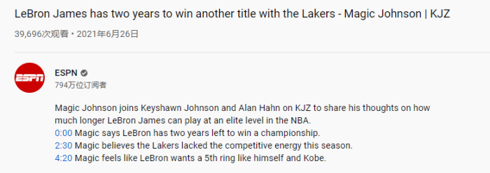 不久前在节目中,魔术师约翰逊表示:“我认为詹姆斯还剩下两年时间的夺冠期,我们必须在两年内完成夺冠。我觉得勒布朗在这两年依旧可以打出统治力,作为湖人的领袖,湖人需要在这两年围绕勒布朗打造正确的争冠拼图——湖人休赛期最首要的任务是寻找一位射手。