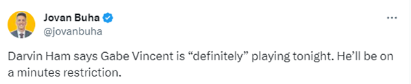 此前文森特被列为大概率出战,赛前哈姆宣布文森特复出,表示:文森特今天肯定会上场,但会有上场时间的限制,大概为14-17分钟;对于文森特复出,哈姆还表示他对于文森特和里夫斯搭档的替补后场感到很兴奋,湖人将可以灵活调整阵容,并称此为发现过程。