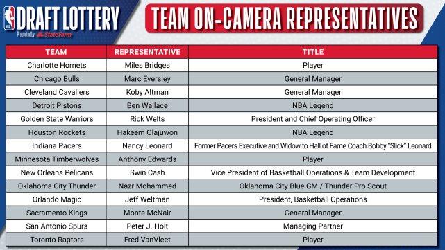 178直播讯 北京时间6月22日,NBA官方公布了14支NBA球队的乐透抽签代表名单,而明天,NBA将进行乐透抽签仪式。具体的代表名单如下——