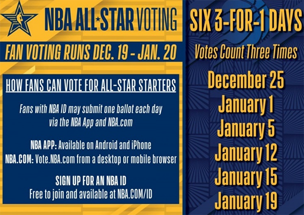 本届NBA全明星的举办地是印第安纳,球迷们的投票时间为期一个月,期间开设有6个三倍投票日。本届全明星正赛将不再设置得分目标和队长选秀,恢复以上的模式,东西部将通过投票各选出12位全明星,分区队长将由得票最多的球员担任。