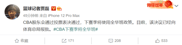 178直播讯 北京时间6月18日,名记贾磊爆料一个震惊的消息,新赛季的CBA将执行全华班,目前,该决议已经向体育总局报批。