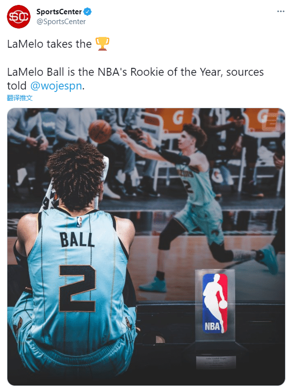 178直播讯 北京时间6月17日,NBA又一大年度大奖出炉,据ESPN名记沃纳罗斯基报道,“三球”拉梅洛击败状元和国王新星荣获年度最佳新秀,美媒纷纷晒照恭喜三球获得最佳新秀。