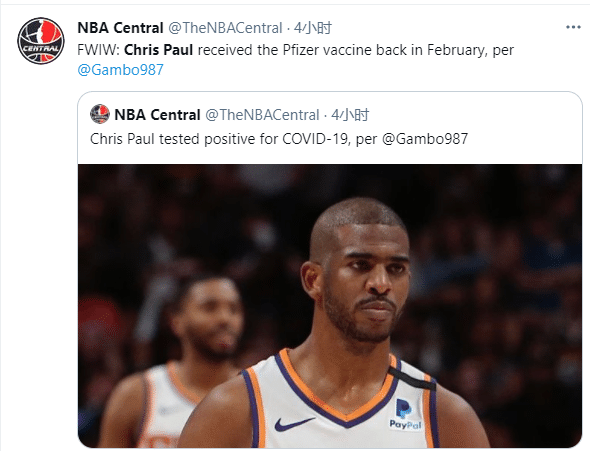 太阳领袖保罗的新冠检测结果呈阳性,虽然他已经注射疫苗,但保罗仍旧触发联盟防疫协议,被强制隔离并且没有回归时间表;此前勇士球员达米安-李注射疫苗后确诊,当时他缺阵了一个月;如今保罗中招,是对太阳的一大重击。