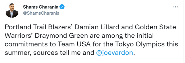 178直播讯北京时间6月16日,据The Athletic报道,开拓者球员利拉德和勇士球员德雷蒙德-格林都已经对美国男篮做出初步承诺,他们愿意随队参加今年夏天的东京奥运会。