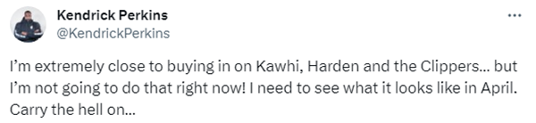 快船豪取8连胜,目前16胜10负排在西部第6位,对于快船的疯狂表现,名嘴帕金斯发推写道:我非常接近押小卡、哈登和快船(夺冠)了,但我现在不会这么做。我得看看他们四月份什么表现。