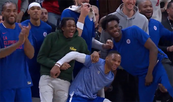 快船替补席同样被点燃了,小卡、威少、塔克等人都笑着为哈登庆祝,威少真的为哈登的表现而开心;若快船老板鲍尔默也在现场,估计他会站起来握拳怒吼激情庆祝。
