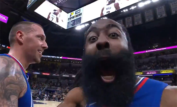 第四节6分09秒,哈登单挑希尔德命中三分并且造犯规,哈登倒地后直接躺在地板上疯狂庆祝,之后快船四名球员一起拉起哈登,哈登起身后冲着镜头怒吼咆哮。