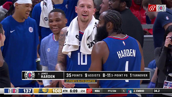 178直播12月19日讯,快船24分大胜步行者从而豪取8连胜,哈登打出快船生涯最佳一战,全场16投12中、三分11中8狂砍35分9助攻3篮板1盖帽1抢断,哈登末节大爆发,连续命中6记三分以及末节8中7,249秒爆砍21分太疯狂,哈登怒吼咆哮激情庆祝,小卡威少都为哈登大笑庆祝。