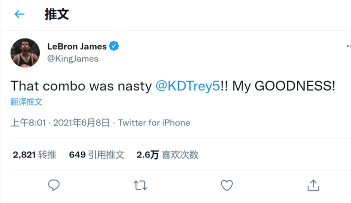 杜兰特还是以前那个杜兰特,根本看不出来他曾经遭遇过跟腱断裂的重伤。在上半场的较量中,KD投篮还是那么无解,10中7三分4中3高效砍下21分!其中有一个回合面对字母哥的防守,死神连续大幅度变向后干拔跳投命中还造成希腊怪兽犯规,这也让湖人球星詹姆斯第一时间发推盛赞:这套动作太丝滑了!