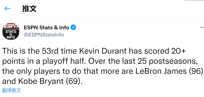 据ESPN统计,这是杜兰特季后赛生涯第53次半场就砍下20+得分,在NBA近25年中,仅次于詹姆斯的96次和科比的69次!