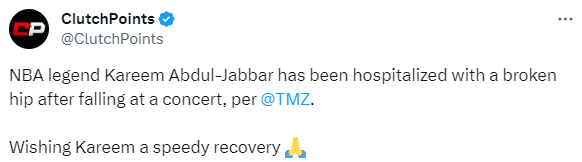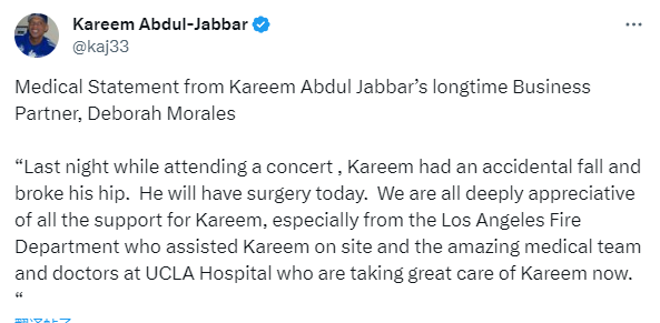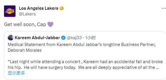 贾巴尔的个人代表黛博拉-莫拉莱斯发表医疗声明——昨晚,卡里姆(贾巴尔)在洛杉矶参加一场音乐会时不小心摔倒,髋部骨折。他今天将接受手术,我们非常感谢堆卡里姆的所有支持,特别是来自在现场协助卡里姆的洛杉矶消防部门以及加州大学洛杉矶分院的医疗团队和医生,他们正在精心照顾卡里姆。