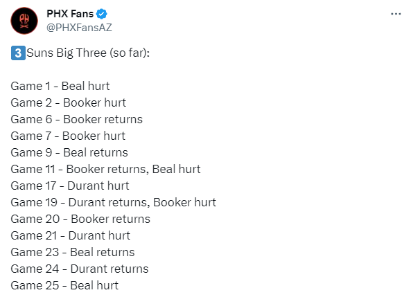 太阳本赛季已经打了25场比赛,三巨头反复遭遇伤病,太阳媒体晒出三巨头的伤病情况——