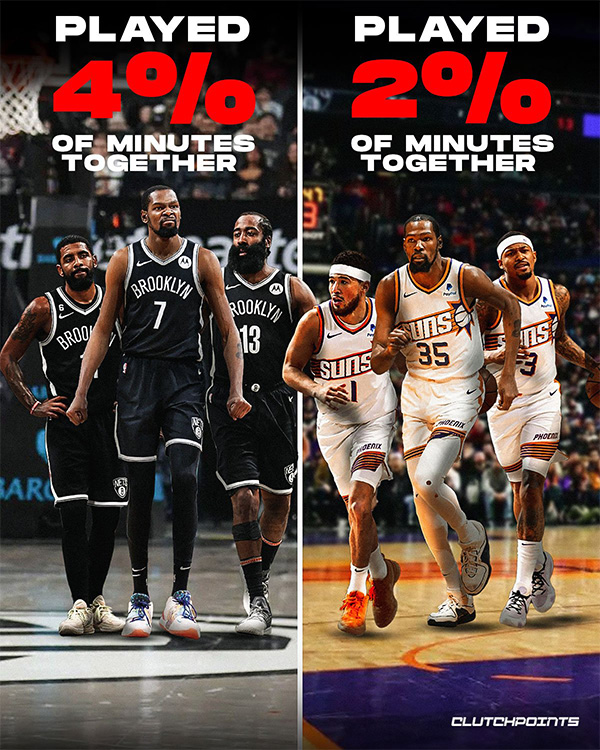 太阳三巨头太惨了,美媒CLutchPoints发推表示太阳三巨头看起来太像篮网三巨头——篮网三巨头杜兰特、欧文和哈登一起出战16场比赛,共同在场365分钟,占期间球队总比赛时间的4%;太阳三巨头至今共联手出战24分钟,占期间球队总比赛时间的2%。