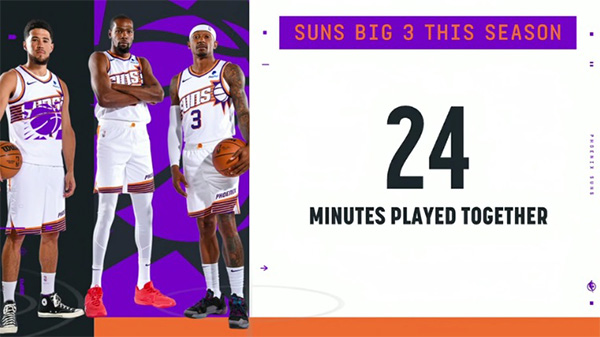 178直播12月17日今年休赛期太阳通过交易引援比尔打造新三巨头,可赛季至今,太阳频频遭遇伤病打击,三巨头仅仅一起出战2场比赛且共同在场仅有24分钟,太阳三巨头出勤率比篮网三巨头还糟糕。