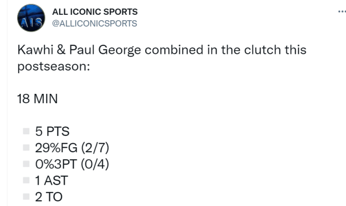 但每每比赛打到关键时刻,两人却又经常掉链子!据美媒hoop central报道,伦纳德和乔治加盟快船以来,两人在第四节或者加时赛最后一分钟,投进即追平或反超比分的出手中,命中率是惨不忍睹的14%!