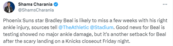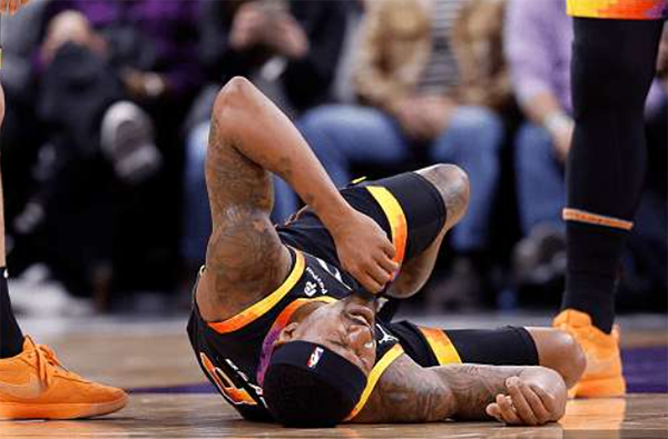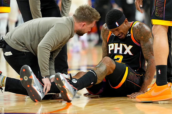 在太阳和尼克斯比赛中,第一节7分28秒,比尔迎着迪文琴佐命中三分,可落地时踩到对手的脚导致自己的右脚踝呈90扭伤,比尔痛苦倒地十分难受,迪文琴佐涉嫌垫脚被吹罚一级恶意犯规;太阳队医赶紧上场为他检查,沃格尔蹲在比尔身边,十分担忧比尔的伤情,布克、阿伦和努尔基奇都站在他旁边。