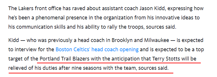 开拓者也到了做出改变的时候了吗?预计斯托茨将会下课,为球队出局而背锅,湖人助教基德将成为开拓者新帅的头号目标,凯尔特人也想抢基德当主帅;基德曾执教雄鹿并亲手调教字母哥。