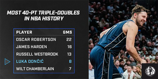 8、东契奇生涯第8次40+三双超越张伯伦升到历史第四位