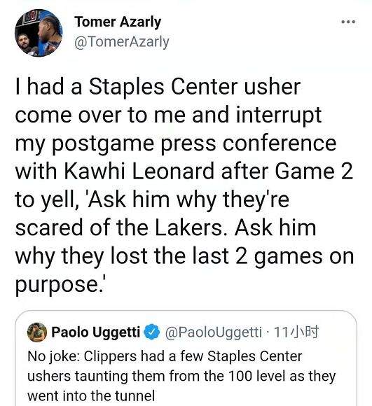 除此之外,记者Tomer Azarly表示在G2结束的时候,有一个在斯台普斯球场中工作的服务人员甚至直接打断了本来进行中的采访,直接质问莱昂拉德为什么这么害怕湖人,要故意输掉常规赛的最后两场比赛。