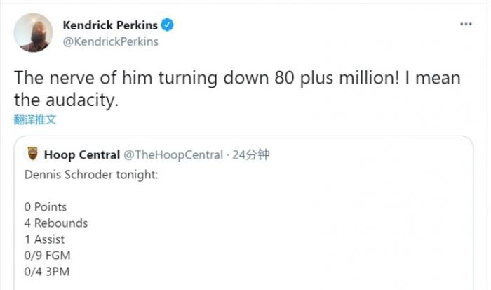 施罗德表现也让名宿帕金斯转发了他的技术统计,并且调侃:他竟然拒绝八千多万的报价!我的意思是他很有胆量。是的,就这样的表现,施罗德还敢期待上亿美元的合同,这份勇气哪怕梁静茹都给不了吧,不过,施罗德也不是完全没有机会,如果他能表现出色,如果他能帮助湖人涉险过关,湖人或许还会考虑再次给出8千万的报价的。