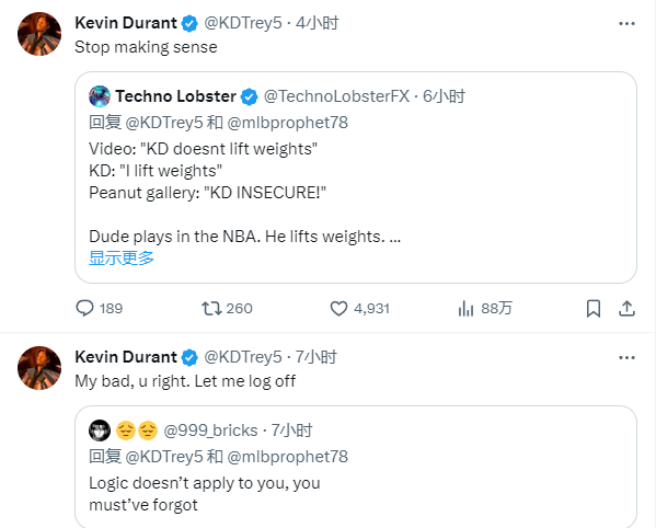 一球迷表示:视频中说KD不举重,KD回应自己举重,球迷居然是杜兰特没安全感,老兄在NBA打球,他举重,他是推特上为数不多的与人互动的运动员之一,我们称他没有安全感是因为他为自己的公然谎言而辩护,世界破碎了。