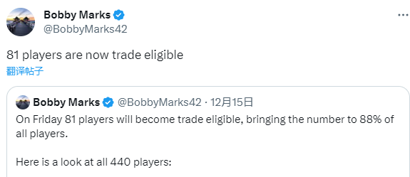 据联盟薪资专家Bobby Marks报道,今年休赛期签约的81名球员都在今天解除交易限制,换言之,这81名球员都可以被交易了。