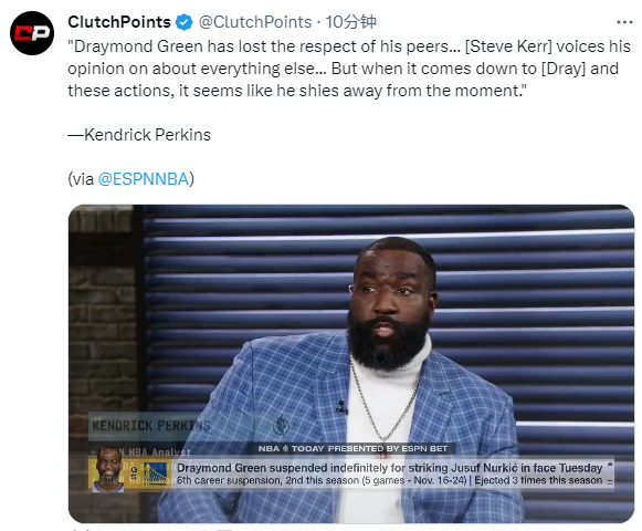 帕金斯还表示:这真的很恼人,老实说,已经够了,追梦已经成为了一个真正的问题。你可以看到球队、科尔、库里都很烦恼。我们身为球迷都很烦恼,想象一下身为当事人的他们会多么烦恼。在比赛的最后阶段,谁来防守努尔基奇呢?是追梦啊,但他做了这种事,搞得自己被驱逐,这一点都不有趣,这一点也不是强硬,而是愚蠢。追梦必须要停下来,勇士有那么多天赋,但现在他却因为情绪崩溃一次又一次地害自己被驱逐。够了,上场专心打篮球吧。