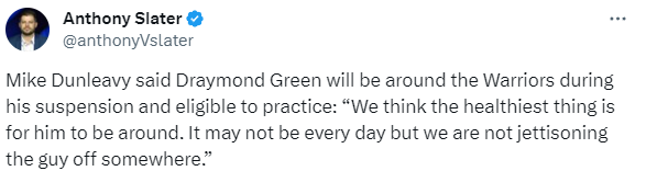 追梦被禁赛期间仍将随队训练,邓利维表示:最健康的方式就是让追梦随队,虽然这可能不是每一天,但我们不会让他离开。