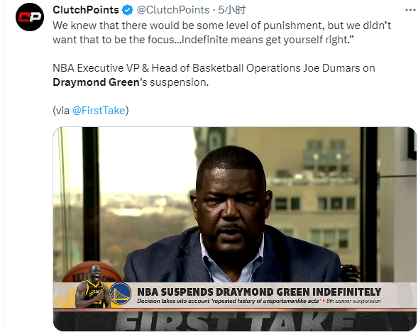 NBA执行副总裁兼篮球运营主管乔-杜马斯在节目中谈及格林的禁赛处罚,杜马斯表示:我们知道会有一定程度的惩罚,但我们不希望这成为焦点,我们更希望注重于我们如何去帮助格林,我们认为无限期禁赛是最好的方式,因为这样人们才不会重点讨论具体禁赛的时间长短(太长或是太短)......无限期意味着让自己改过自新。我们希望看到你最好的状态,而最好的方式就是让你自己回到你应该有的状态和位置上。