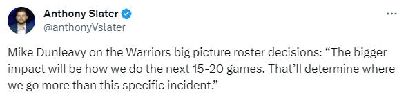 谈到格林禁赛对球队在大局上的阵容决策,邓利维表示:更大的影响将是我们在接下来的15-20场比赛中的表现。这将决定我们未来的去向,比这一特定事件(追梦无限期禁赛)更为重要。