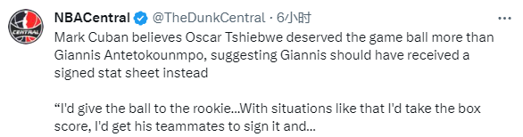 对于NBA发生罕见的“争球”闹剧,独行侠老板马克-库班谈及此事,并表示:我会把这个比赛用球交给希布韦(2023年落选秀)。在字母这种情况下,是我的话,我会拿走这场比赛的数据统计表,让所有的队友签上名字,然后裱起来。