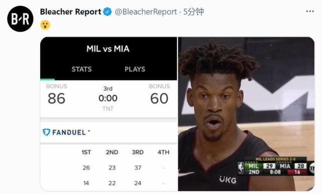 本场比赛,回到迈阿密的热火首节就陷入了被动,他们第一节仅仅得到14分,已经落后对手12分,半场比赛结束时,热火已经落后13分,表面看上去分差并不算大,但整个上半场,热火仅得36分,而只有巴特勒一人在线,他12投6中拿到了16分7板1助1断,而热火其余所有球员合计仅仅33投8中。此外,半场两队的篮板对比,热火21-35雄鹿远远落后。