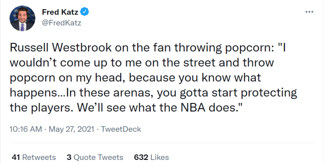 威少本人也回应了这件事。“人们可不敢在街上冲着我的脑袋扔爆米花,因为你知道接下来会发生什么……在这些球馆里,你得开始保护球员,我们拭目以待看看联盟怎么做。”