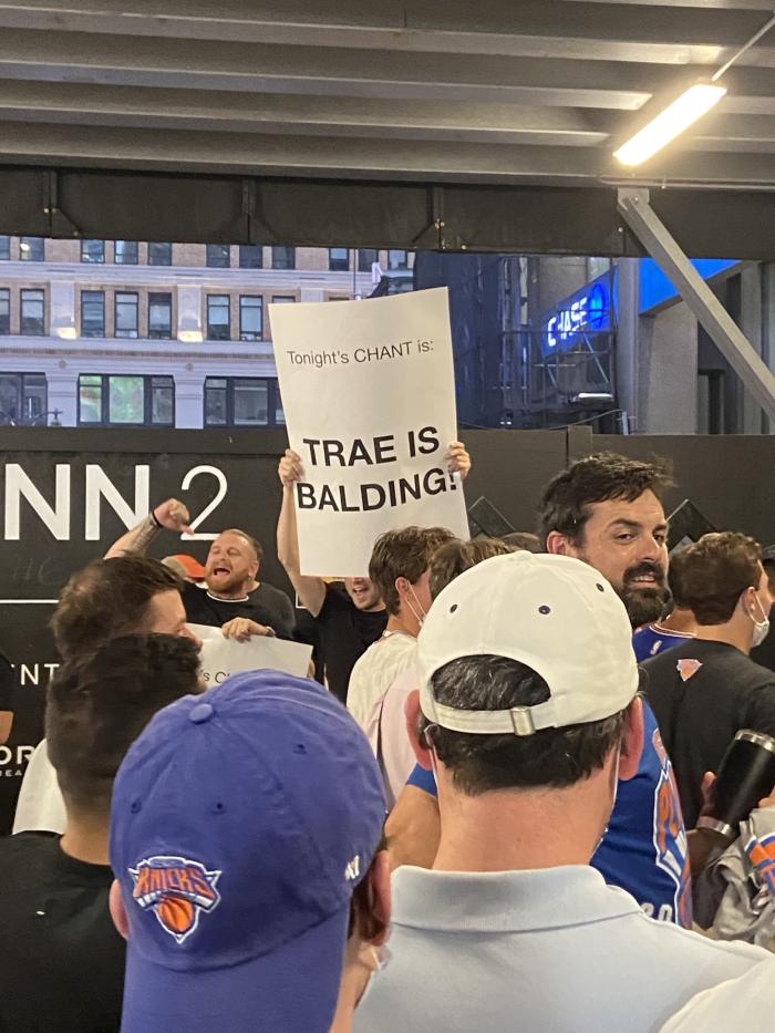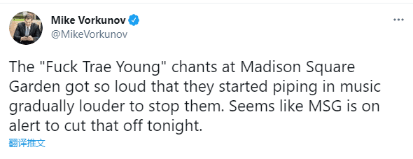 据Mike Vorkunov报道,麦迪逊花园球馆再次响起“Fxxk 特雷杨”谩骂声,当特雷杨跑进球场时,现场嘘声一片;尼克斯球迷高举“特雷杨秃顶”的标语,标语中还写着:特雷杨只有22岁,他的头发正在以惊人的速度变薄,他的头顶已经秃了。