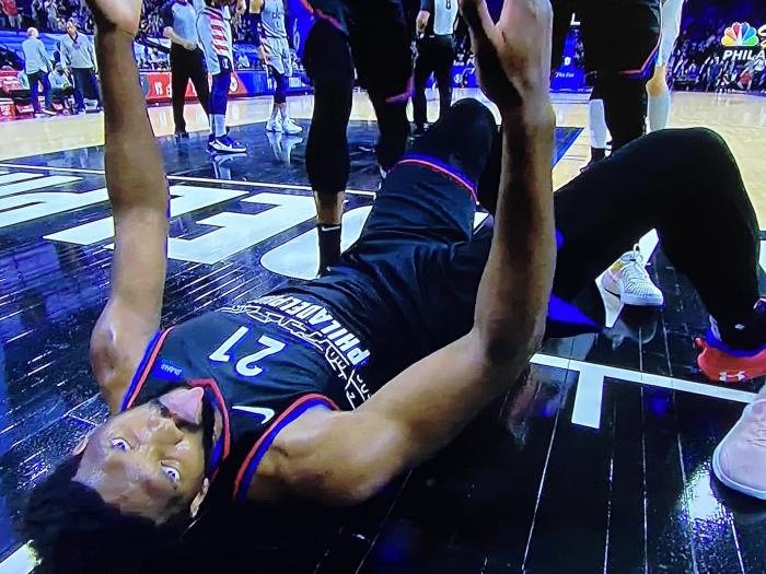 上半场快结束时,西蒙斯持球发动快攻,恩比德跟进并且接球后打成2+1,恩比德摔出底线,倒地后他疯狂庆祝,不仅振臂点燃现场,而且做了一个有些邪恶的抖臀秀好腰的动作;恩比德众队友过来拉起他,站起来继续点燃现场,球迷集体高呼MVP。
