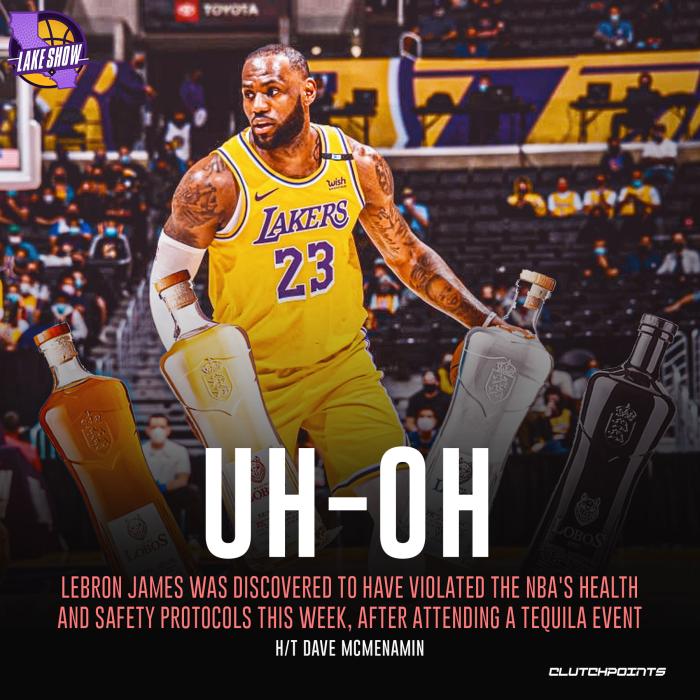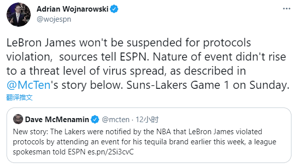 此前名记报道詹姆斯因参加线下品酒活动而违反联盟防疫协议,不过ESPN名记沃纳罗斯基报道,詹姆斯并不会因此被禁赛因为这次活动的性质没有达到病毒传播的性质,当时在场的人都做了核酸检测并且接种了疫苗。