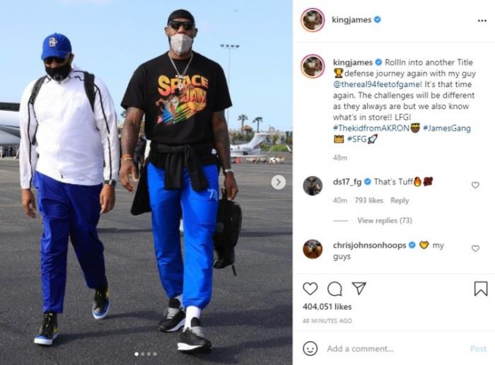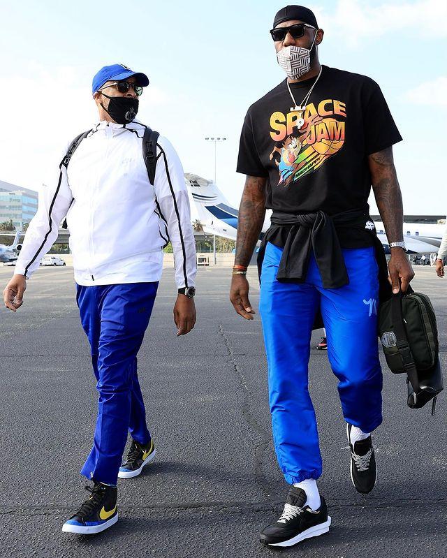 36岁詹姆斯身穿蓝色运动裤和印有《空中大灌篮2》字样的黑色T恤,把外套绑在腰间,佩戴黑色墨镜十分霸气,更新Ins写道:准备好冲击另一个总冠军,和菲尔-汉迪(湖人助教)一起踏上卫冕之路,又是一年季后赛。挑战总会不同但我们知道接下来会发生什么!!给我冲#来自阿克伦的孩子#詹姆斯帮