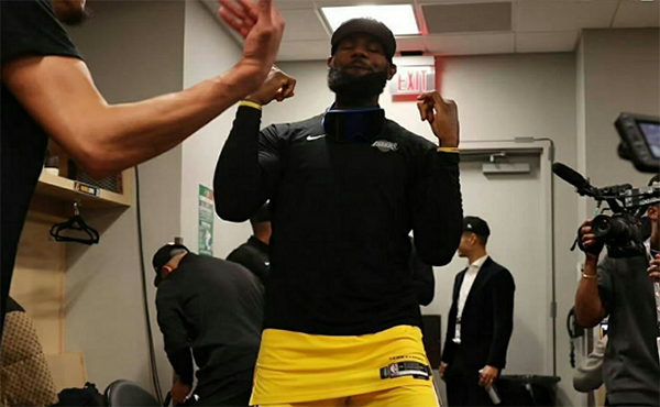 当里夫斯迎着拿鞋子防守的琼斯命中压哨三分球之后,詹姆斯兴奋庆祝,此役他没有出战。湖人领先18分进入到第四节,包括解说员都表示比赛很有可能提前进入到垃圾时间,没想到神剧情就这样出现了。
