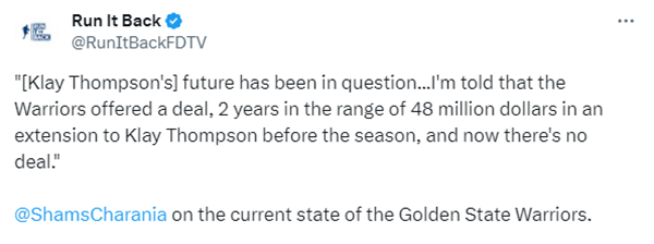由于在合同年限和金额上存在重大分歧,克莱与勇士提前续约失败,本赛季开始前,shams曾表示克莱很可能在2024年成为自由球员。