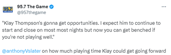 上一场勇士不敌太阳,克莱在关键时刻被弃用,当时克莱很不开心,坐在替补席十分沮丧,对于克莱目前在勇士队的角色,勇士记者Anthony Slater表示:克莱-汤普森仍会得到机会。我预计他会在大多数比赛中继续首发和终结比赛。但是现在,如果他打得不好,他也可能会被换下场。