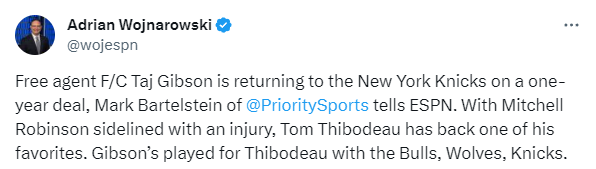由于米切尔-罗宾逊遭遇脚踝伤势而无法出战,尼克斯才决定与吉布森签下一年合同。