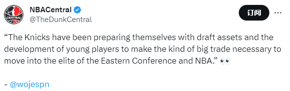 目前尼克斯13胜9负排在东部第6位,兰德尔和布伦森是现在这支球队的核心球星,未来尼克斯会进行什么大交易吗?名记Woj爆料:尼克斯一直在准备用其手中的选秀资产和对年轻人的培养,来进行一笔必要的大交易,从而进入东部及整个联盟的精英行列。