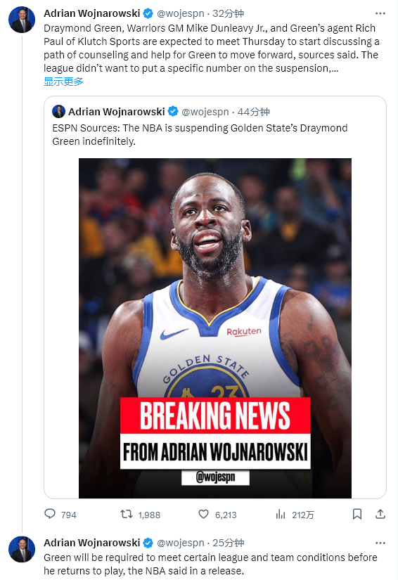 追梦何时能够解禁复出?暂无具体禁赛场次,woj进一步报道,追梦、勇士总经理邓利维和追梦的经纪人里奇-保罗将在周五会面,以帮助他在职业生涯中继续向前发展;联盟不想给出追梦禁赛的具体数字,但会给他时间处理他所面临的挑战。