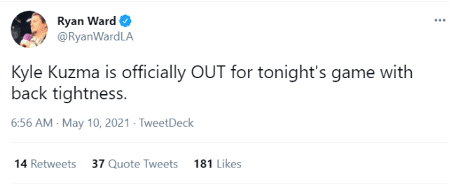 178直播讯 北京时间5月10日,湖人官方宣布,库兹马因腰部肌肉紧张缺席今日对太阳的比赛。一天前,库兹马的状态就列为doubtful(大概率不打),而今天赛前,库兹马的状态正式更改为OUT(缺阵)。詹姆斯、施罗德仍未复出,湖人缺兵少将的问题变得更加严重。