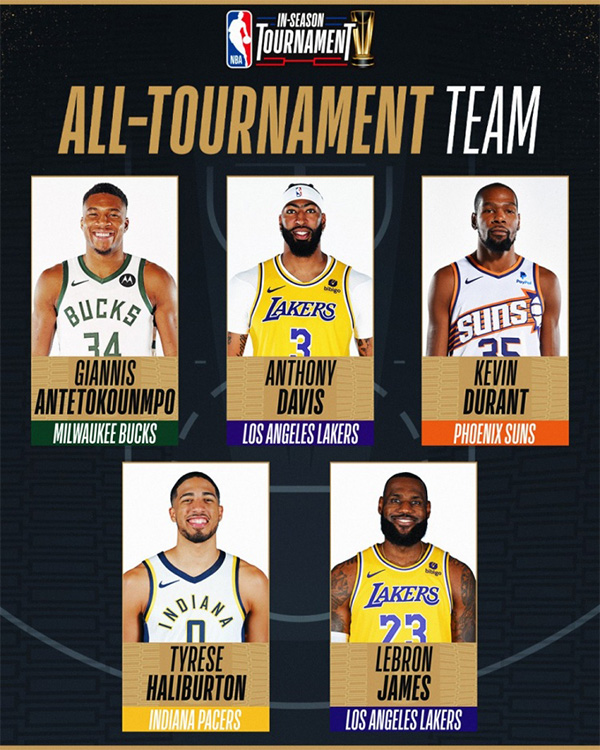 NBA官方正式公布了首届季中锦标赛最佳阵容:詹姆斯、浓眉、字母哥、哈利伯顿和杜兰特,每人可以获得一颗黑色水晶篮球奖杯;从最佳阵容的投票结果可以看出,詹姆斯、浓眉、字母哥和哈利伯顿都是获得20票从而全票当选,杜兰特得到7票